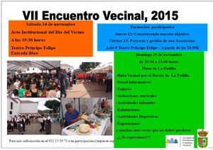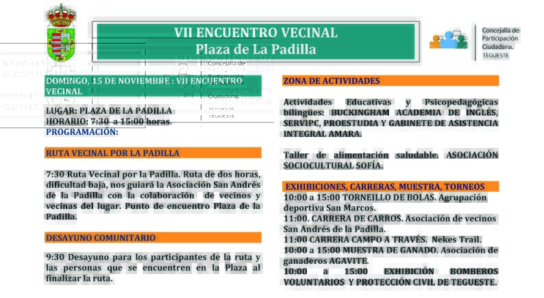 El municipio de Tegueste celebrará el domingo 15 de noviembre, la VII edición de su “Día del Vecino”, una iniciativa que este año tendrá lugar en el Barrio de La Padilla y donde se congregarán decenas de colectivos y asociaciones de la Villa en una jornada de ocio, conocimiento y solidaridad; y donde se llevarán a cabo multitud de actividades e iniciativas.