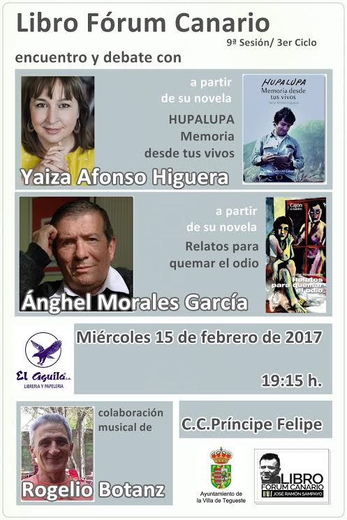 El Centro Cultural Príncipe Felipe de Tegueste, ubicado en las instalaciones del teatro teguestero, acogerá el próximo miércoles 15 de febrero de 2017, la novena edición del tercer ciclo proyecto Libro Fórum Canario que tendrá como protagonista a los escritores, Yaiza Afonso Higuera, con su obra “Hupalupa. Memoria de tus vivos”, y Ánghel Morales García, con su libro “Relatos para quemar el odio”.