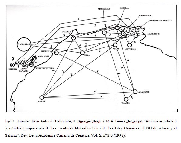 Para el doctor Ignacio Reyes García, uno de los especialistas más reconocidos de la lengua amazigh, la clave del topónimo estaría en esta zona de Túnez-Argelia (comunicación personal). Si observamos el cuadro siguiente, realizado por Juan Antonio Belmonte[19] , podemos observar como estadísticamente la zona donde se sitúa el Antiguo Tagaste romano presenta las mayores similitudes en cuanto a la escritura tifinag de las Islas Canarias y la norteafricana.