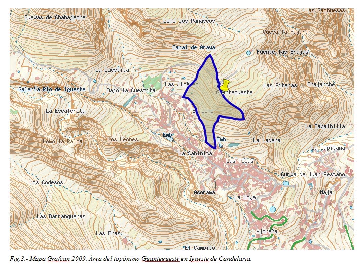 Para esta isla, aunque no se han incluido en el mapa de distribución inicial debemos tener en cuenta el topónimo IGUESTE (vertiente masculina del topónimo), presente en dos municipios (Igueste de San Andrés, Santa Cruz de Tenerife y el Igueste de Candelaria). Que participa plenamente de la forma consonántica GTS, perdiendo el componente femenino de la T. Nos aparece documentado al menos desde 1499 en las Datas de repartimiento para el caso de San Andrés [4]: “ Rodrigo el Coxo. Una f. de ta. De r. en el valle de Gueste, q. es en Naga, e unas Figueras q. en el valle están en una cueva con el auchón de arriba e tas. q. sembréis. 4-V-1499.