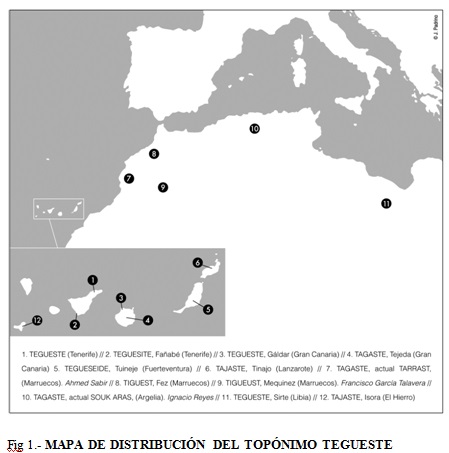 Como se puede observar en el mapa adjunto, el topónimo “Tegueste”, tiene una amplia distribución en la geografía bereber del Norte de África y por extensión al archipiélago canario. Su presencia está constatada desde el cercano Marruecos [ Tagaste(actual Tarrast), Tigueust y Tiguest], Argelia [Tagaste (actual Souk Aras)] hasta Libia (con la forma Tegueste). En el archipiélago canario aparece con distintas formas, expresadas por distintos autores, en muchos casos desde una perspectiva de similitud formal, pero siempre con ciertos matices que cuestionan su validez para la lingüística. Aun así hemos querido recogerlas ya que de una u otra forma se han relacionado con el Tegueste de nuestro municipio. En Tenerife [Tegueste y Teguesite (Fañabé)], en Gran Canaria [Tagaste (Tejeda), Tegueste (Gáldar)], en Lanzarote [Tajaste (Tinajo)], Fuerteventura [Tegueseide (Tuineje)] y en el Hierro con la forma Tajaste (Isora).