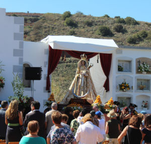 A su llegada al cementerio, fue el cantante tinerfeño Chago Melián el que recibió a la Virgen de Nuestra Señora de Los Remedios con el tradicional “Ave María”. La imagen permaneció en el recinto municipal hasta las 17:00 (tras la misa oficiada por el cura párroco de San Marcos Evangelista, Miguel Ángel Navarro Mederos), que partió de nuevo hasta la Iglesia de San Marcos Evangelista.