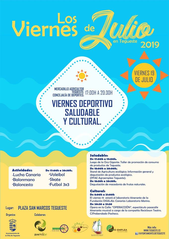 El programa Los Viernes de Julio 2019 continúa su curso y este viernes 19 de julio (17:00 – 20:30 horas), se celebra la tercera sesión bajo el lema Viernes Deportivo, Saludable y Cultural. La Concejalía de Desarrollo Local del Ayuntamiento de Tegueste, que dirige el edil Manuel Martín, organiza esta actividad con la colaboración de las áreas de Deportes y Cultura.