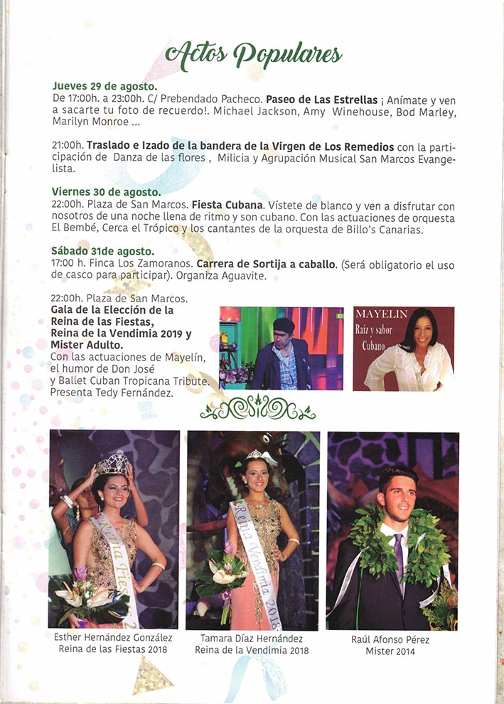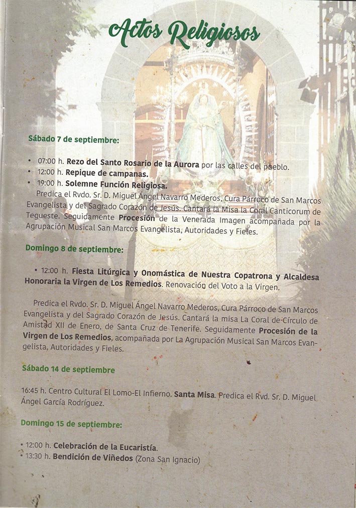 A continuación todos los Actos religiosos y populares que tendrán lugar en Tegueste en honor a la Virgen de los Remedios.