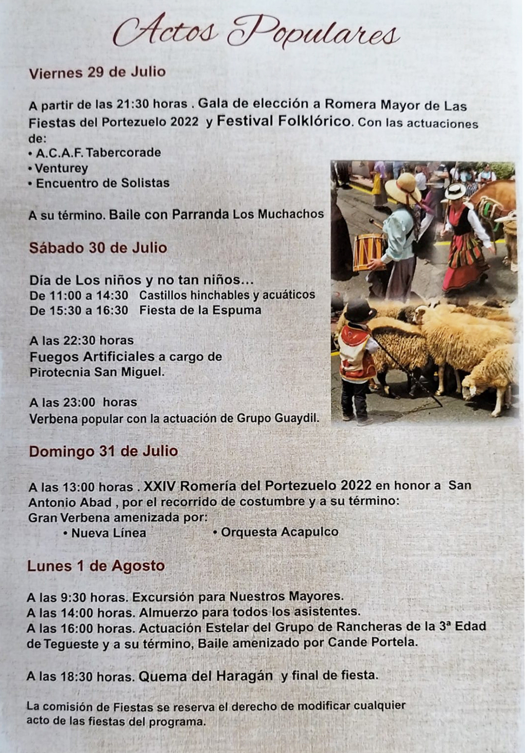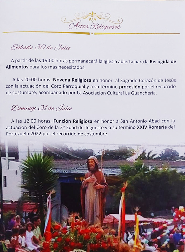 El Portezuelo acoge las Fiestas en Honor a San Antonio Abad que cada año llenan de tradición las calles de este barrio de Tegueste. Uno de los momentos de más tradición  será la celebración de la Romería en Honor a San Antonio Abad, que tendrá lugar el domingo 31  de julio, a partir de las 13:00 horas.
