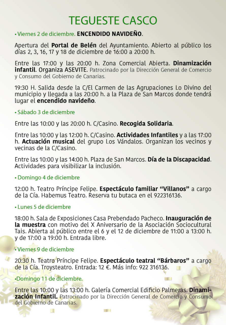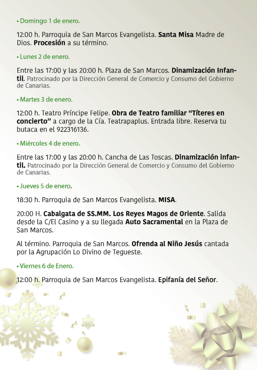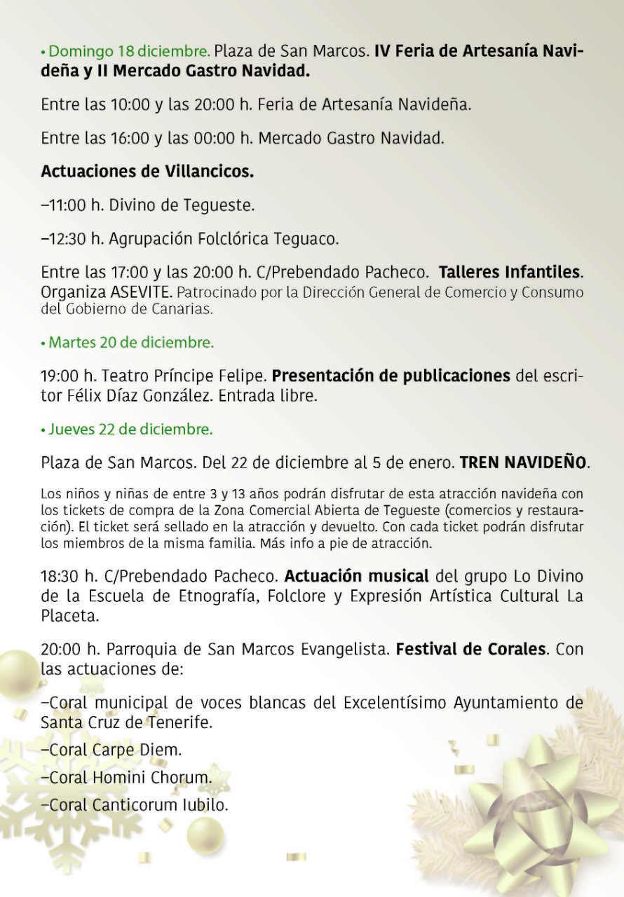 Programa de Navidad en Tegueste 2022 InfoTegueste2022-12-01T20:52:00+01:0001/12/2022| Comparte la noticia! FacebookXLinkedInWhatsAppCorreo electrónico Artículos relacionados Programa de las Fiestas de San Marcos Evangelista Programa de las Fiestas de San Marcos Evangelista 28/03/2025 | Sin comentarios Comienza la VI Feria de Artesanía Navideña de Tegueste Comienza la VI Feria de Artesanía Navideña de Tegueste 11/12/2024 | Sin comentarios El Ayuntamiento de Tegueste presenta su programación navideña 2024 con una agenda llena de actividades para toda la familia El Ayuntamiento de Tegueste presenta su programación navideña 2024 con una agenda llena de actividades para toda la familia 01/12/2024 | Sin comentarios Tegueste da inicio a las Fiestas de San Andrés La Padilla 2024 con una programación que aúna cultura, gastronomía y ocio Tegueste da inicio a las Fiestas de San Andrés La Padilla 2024 con una programación que aúna cultura, gastronomía y ocio 19/11/2024 | Sin comentarios Ruta: De Parrandas y Bodegas por San Andrés Ruta: De Parrandas y Bodegas por San Andrés 17/11/2024 | Sin comentarios