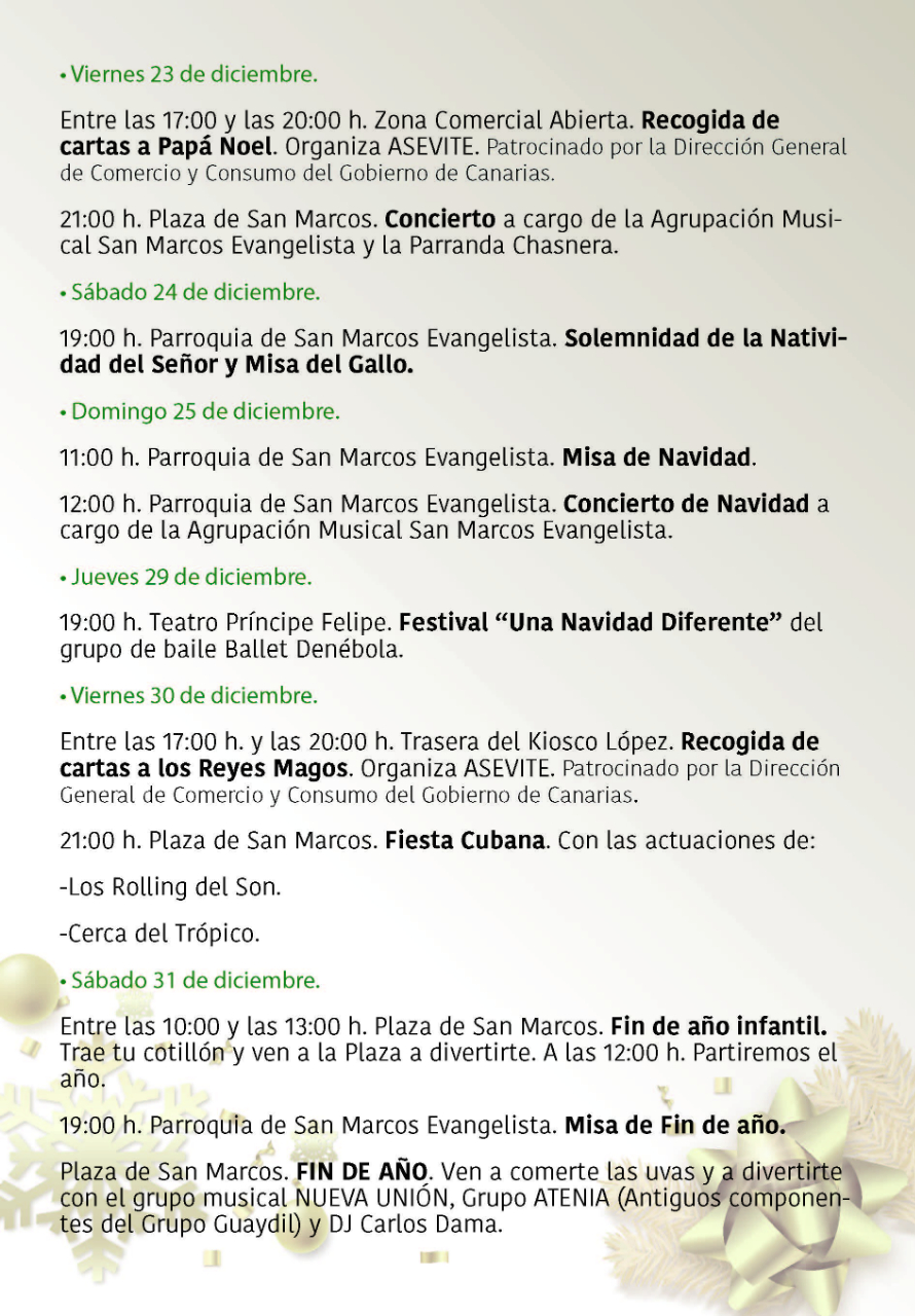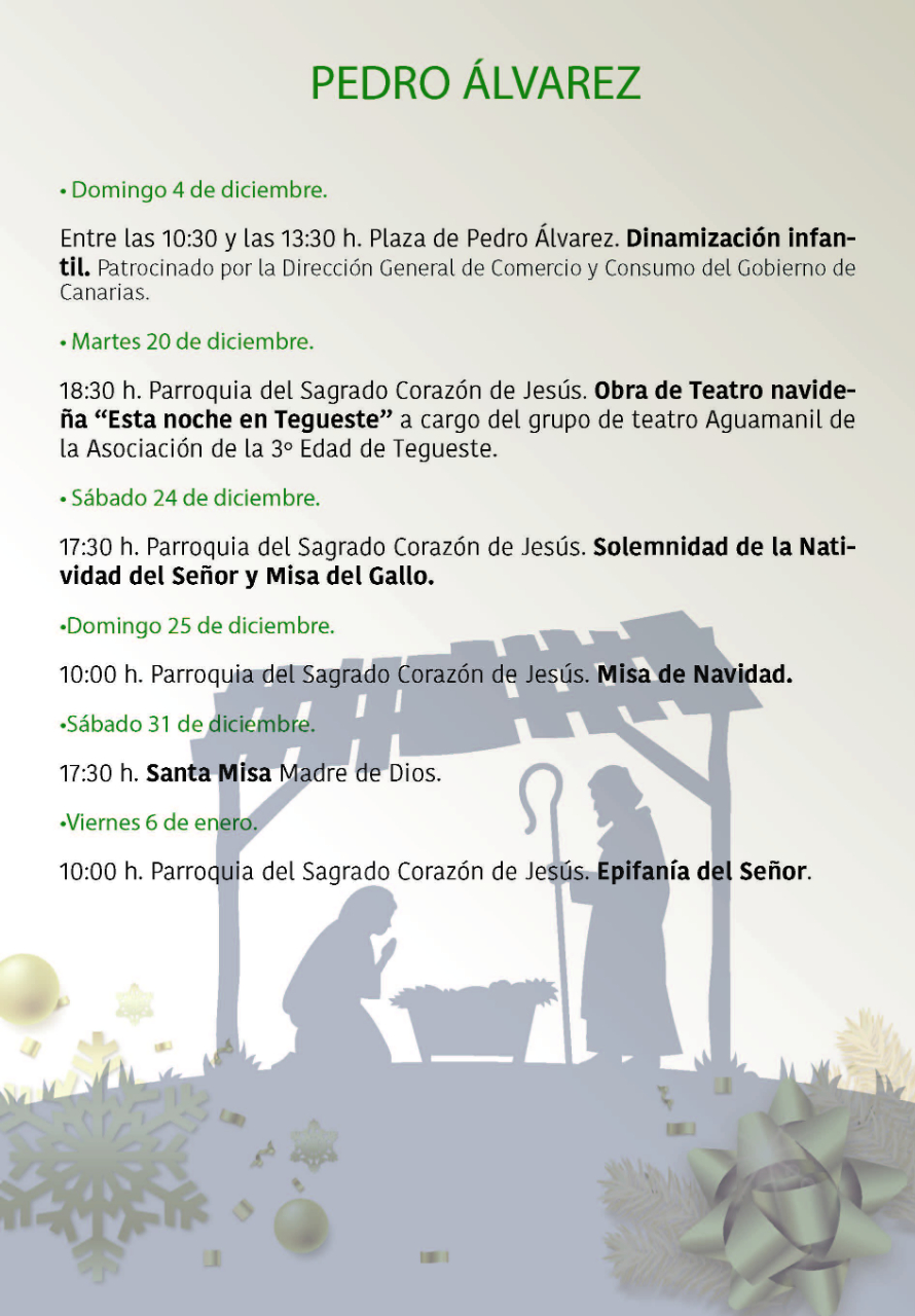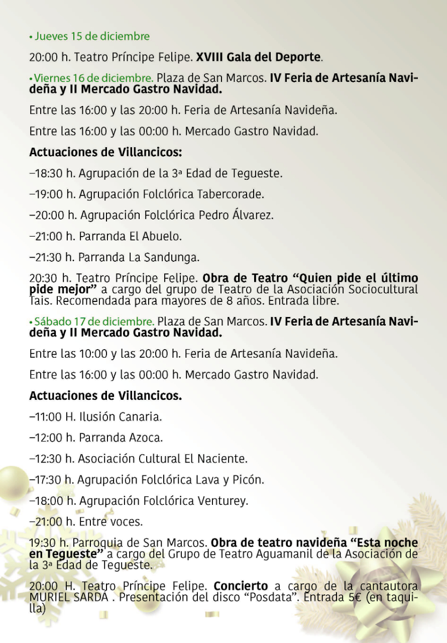 Programa de Navidad en Tegueste 2022 InfoTegueste2022-12-01T20:52:00+01:0001/12/2022| Comparte la noticia! FacebookXLinkedInWhatsAppCorreo electrónico Artículos relacionados Programa de las Fiestas de San Marcos Evangelista Programa de las Fiestas de San Marcos Evangelista 28/03/2025 | Sin comentarios Comienza la VI Feria de Artesanía Navideña de Tegueste Comienza la VI Feria de Artesanía Navideña de Tegueste 11/12/2024 | Sin comentarios El Ayuntamiento de Tegueste presenta su programación navideña 2024 con una agenda llena de actividades para toda la familia El Ayuntamiento de Tegueste presenta su programación navideña 2024 con una agenda llena de actividades para toda la familia 01/12/2024 | Sin comentarios Tegueste da inicio a las Fiestas de San Andrés La Padilla 2024 con una programación que aúna cultura, gastronomía y ocio Tegueste da inicio a las Fiestas de San Andrés La Padilla 2024 con una programación que aúna cultura, gastronomía y ocio 19/11/2024 | Sin comentarios Ruta: De Parrandas y Bodegas por San Andrés Ruta: De Parrandas y Bodegas por San Andrés 17/11/2024 | Sin comentarios
