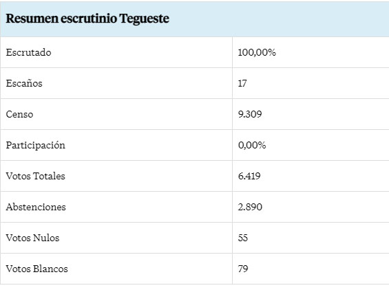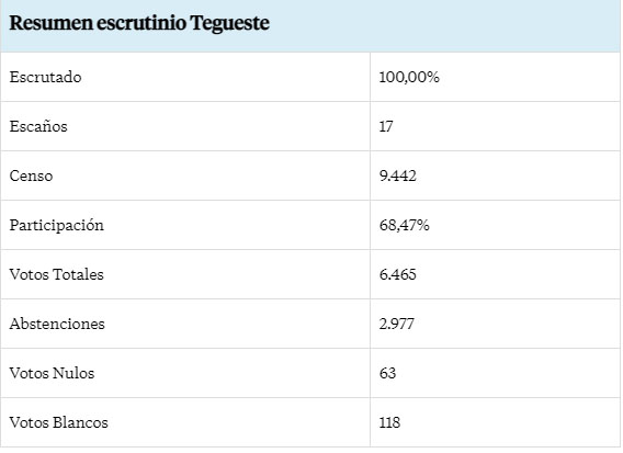Los resultados de las elecciones municipales del 28-M en Tegueste se pueden comparar, con los resultados registrados en la última convocatoria electoral. Para cada partido político se ofrece el número de votos conseguidos y la cifra que la misma formación recibió en la anterior cita con las urnas. Asimismo, se ofrecen los datos totales de abstención y el número de votos en blanco contabilizados.