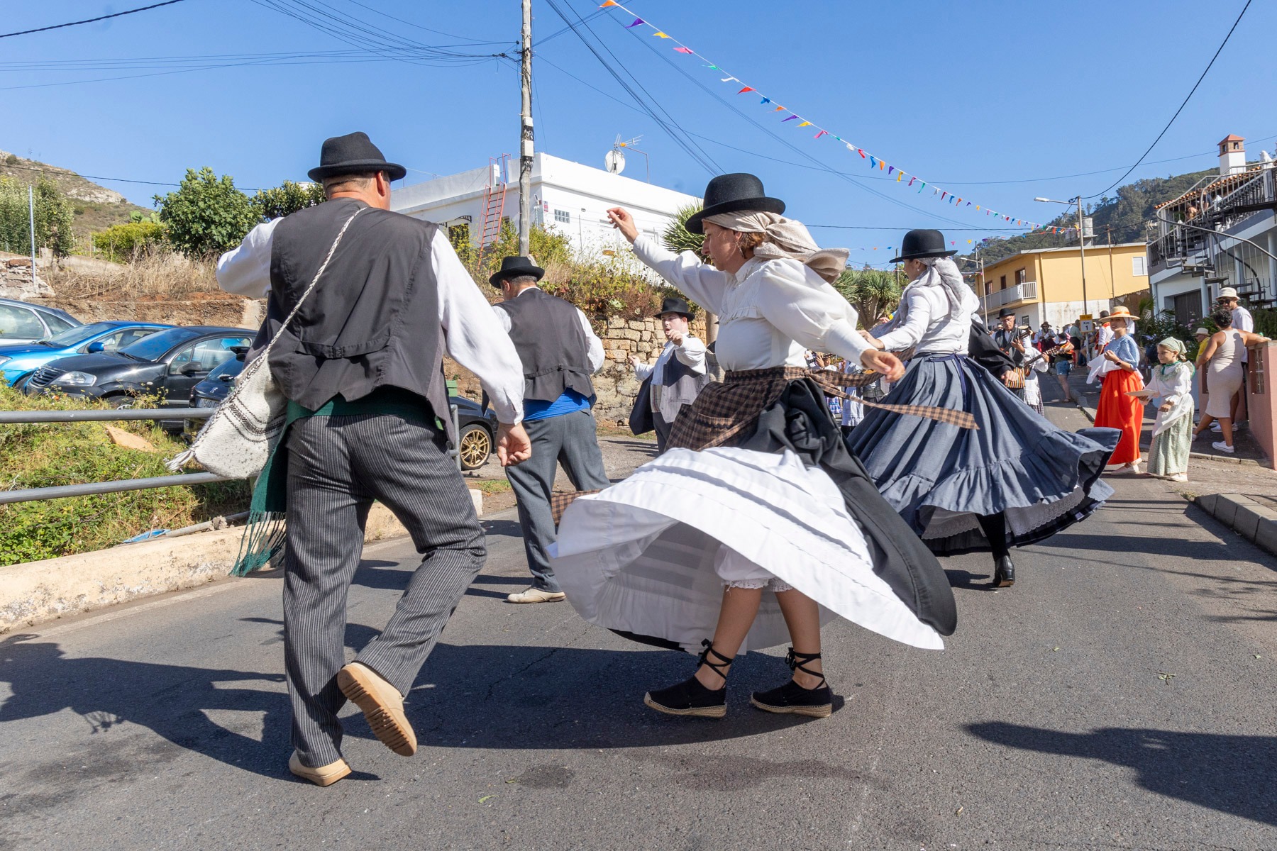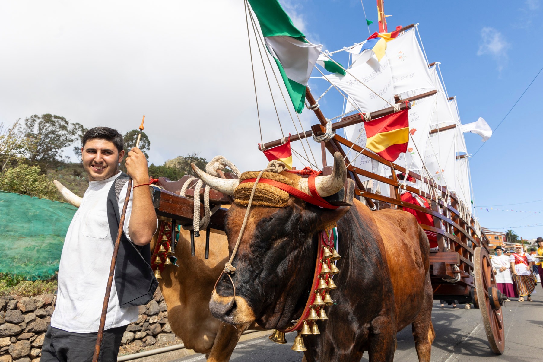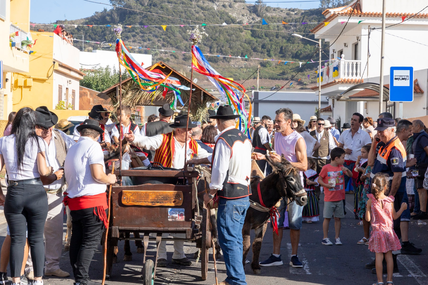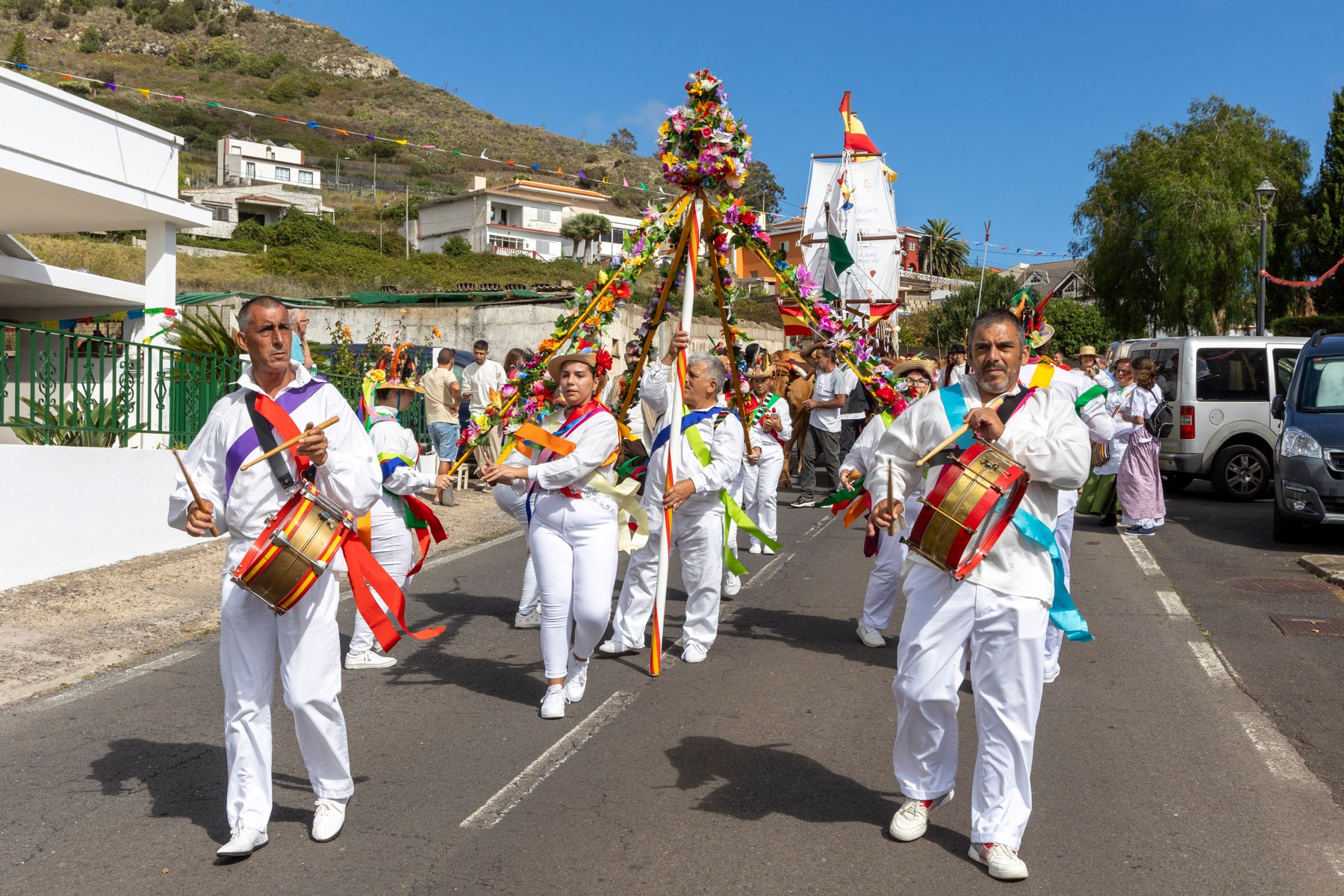 En el paseo romero, encabezado por la Danza de las Flores, el Barco de Pedro Álvarez y algunas yuntas, participaron más de 20 carros y varias parrandas como la propia del barrio, Lava y Picón, Tercera Edad de Tegueste, Sandunga, Amigos de Guamasa e Ilusión Canaria, que pusieron el ritmo en la pasada jornada.