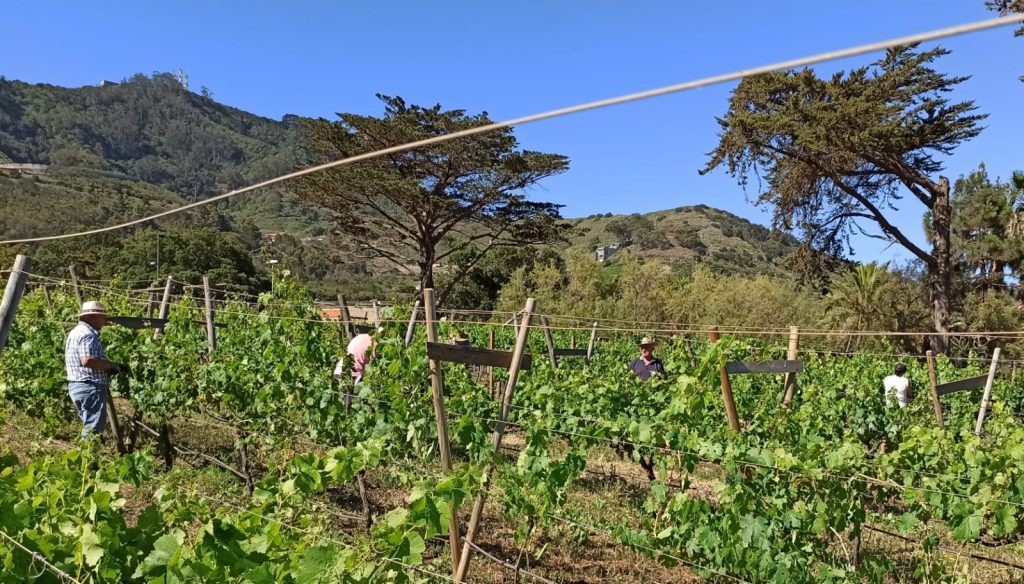 Miembros de la Directiva y socios de AVITE realizan la poda en verde y el deshojado de la viña en la finca
